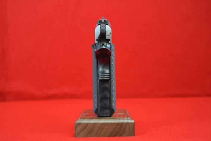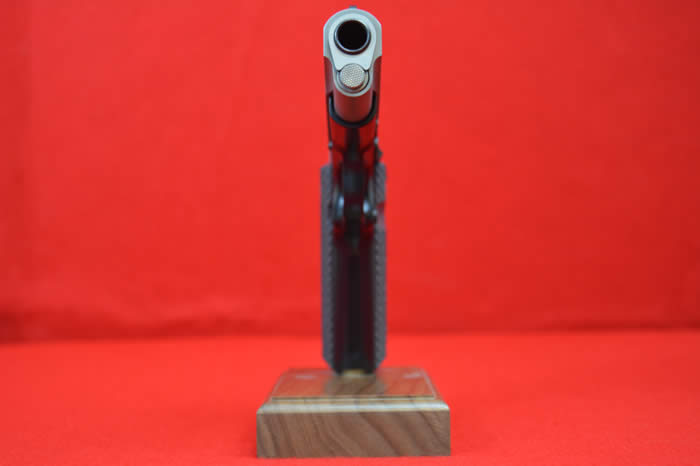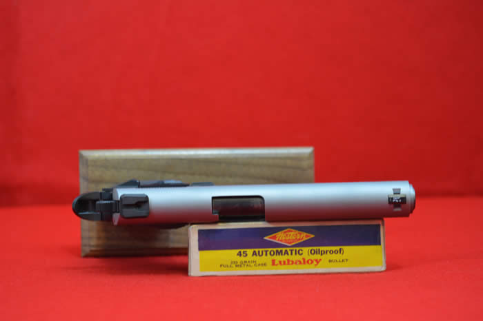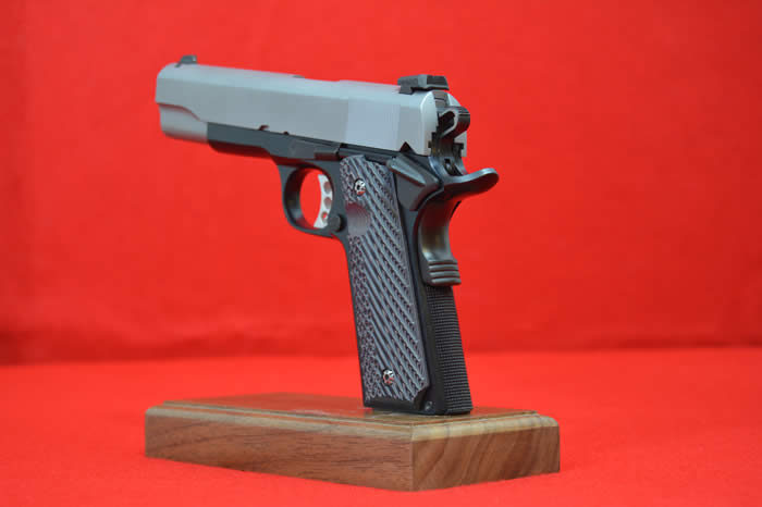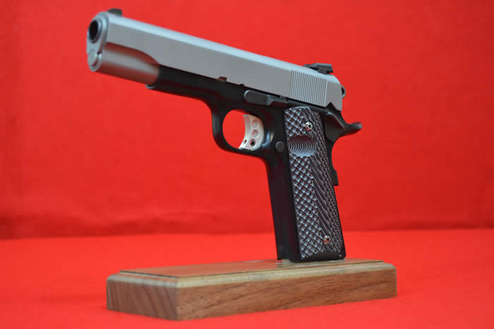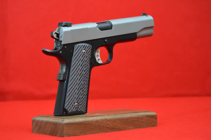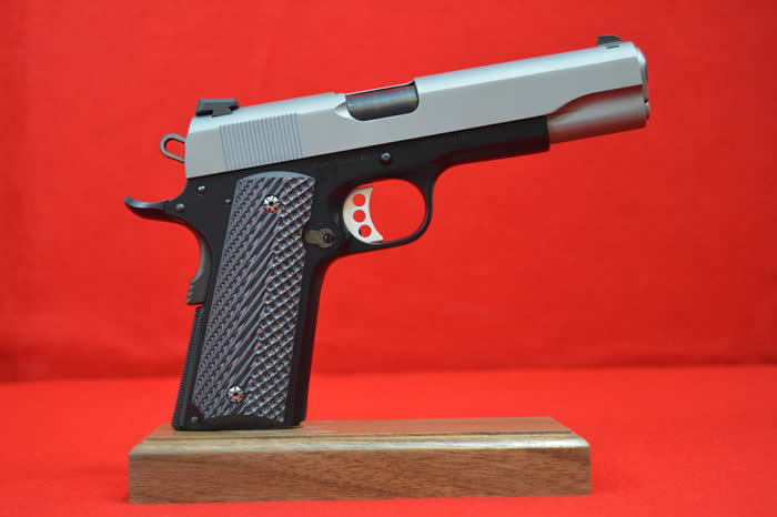 This pistol is an R. Robbins Custom built full size 1911 45 acp with a Stainless Steel slide with a lowered and flared ejection port and hand fit stainless steel barrel bushing. The barrel is chrome moly steel. The frame is an RIA carbon steel frame with KG Gun Kote baked epoxy black finish. The pistol features an upswept high grip safety, commander style skeleton hammer, and a checkered 1911 (flat) style main spring housing. The sights are NOVAK low profile carry rear sight with a Trijicon dovetailed front sight. The trigger is a 3-hole long aluminum trigger with adjustable stop screw. The grips shown are black and grey G10 with engraved stainless grip screws. This pistol has been test fired only since the build.